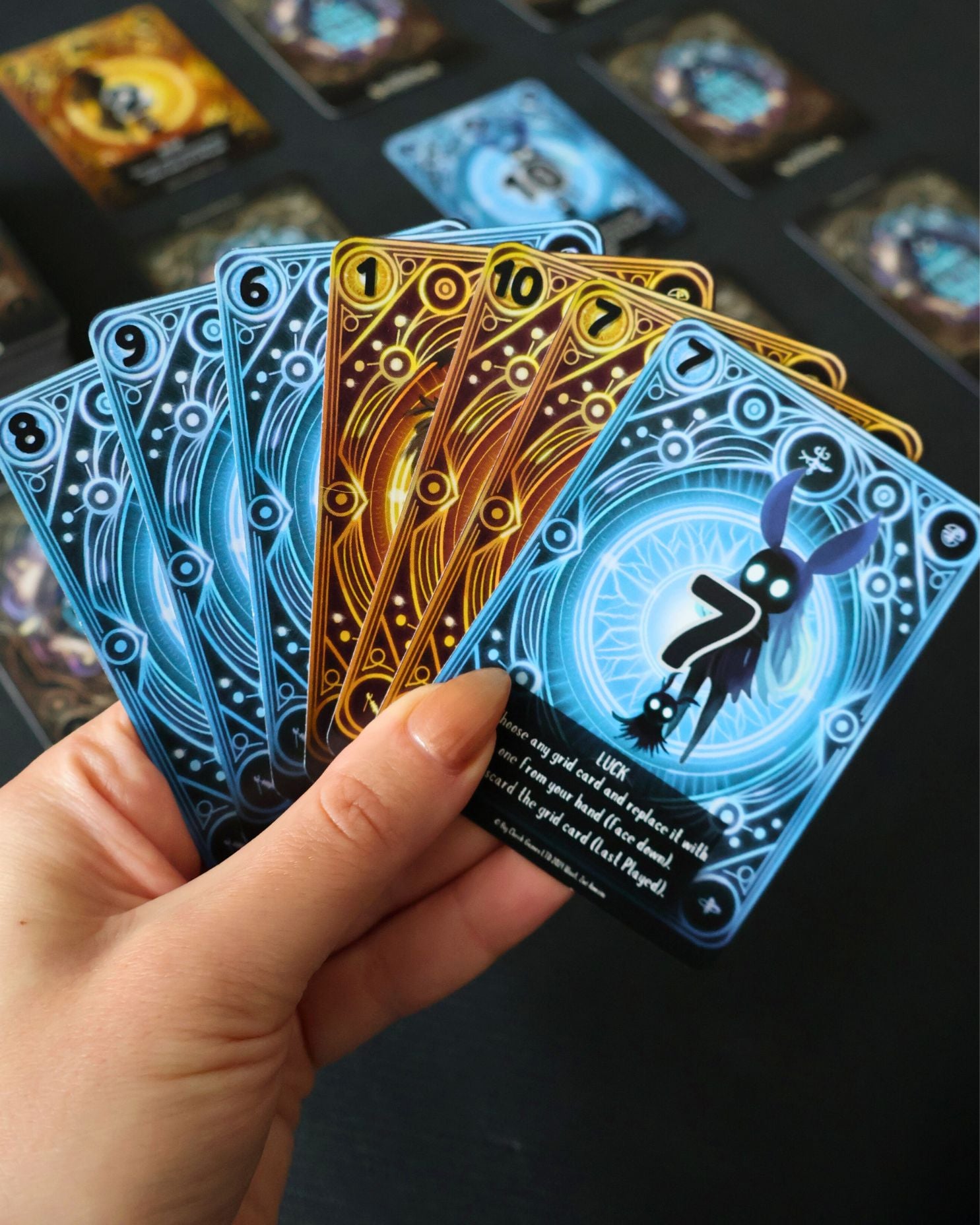 Fits into a small, travel-friendly box and needs only a tiny play area. Even the smallest café table becomes a battlefield of bluffing and shadow creatures.